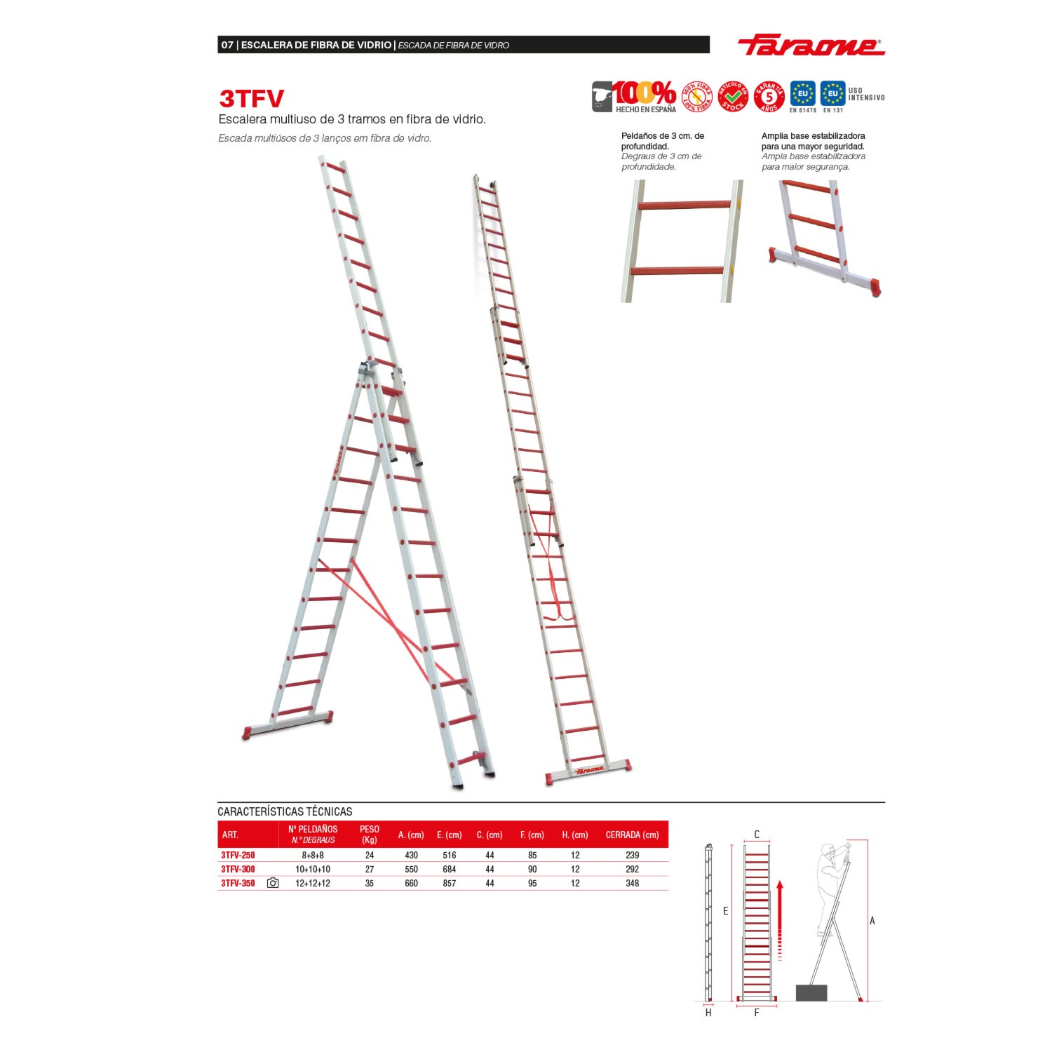 La escalera 3TFV está compuesta de tres tramos fabricados en fibra de vidrio; ideal para trabajos con riesgos eléctricos.