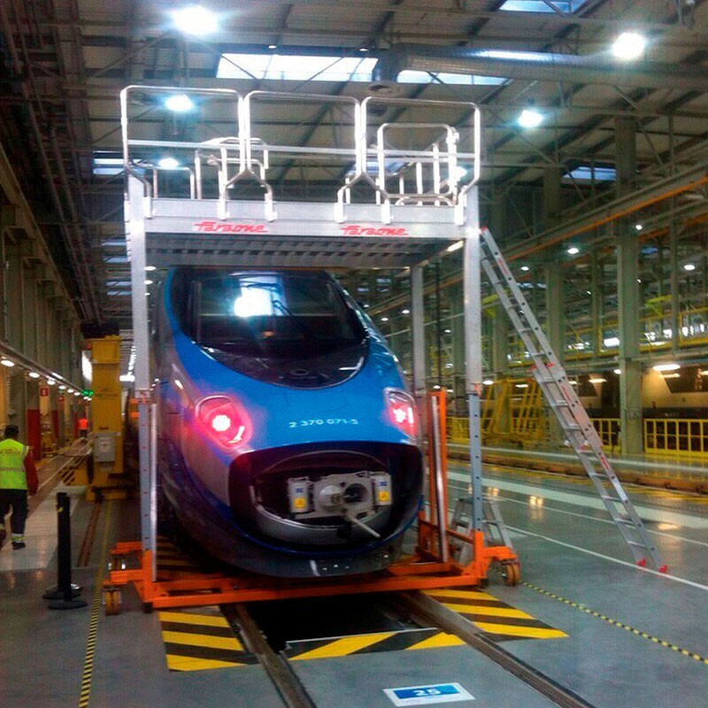 Plataforma ajustable en altura con altura libre al suelo para permitir el acceso sobre la parte delantera del tren (luna, faros, etc.).