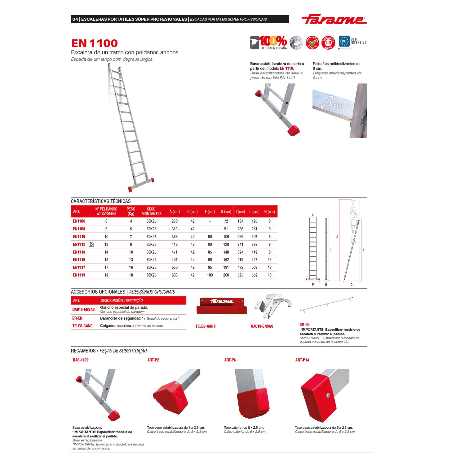 Tiene los peldaños antideslizantes con 8 cm de profundidad y la base estabilizadora con 2 tacos de goma que le confiere mayor seguridad y asegura el cumplimiento de las actuales normativas europea EN 131-1,2,3.