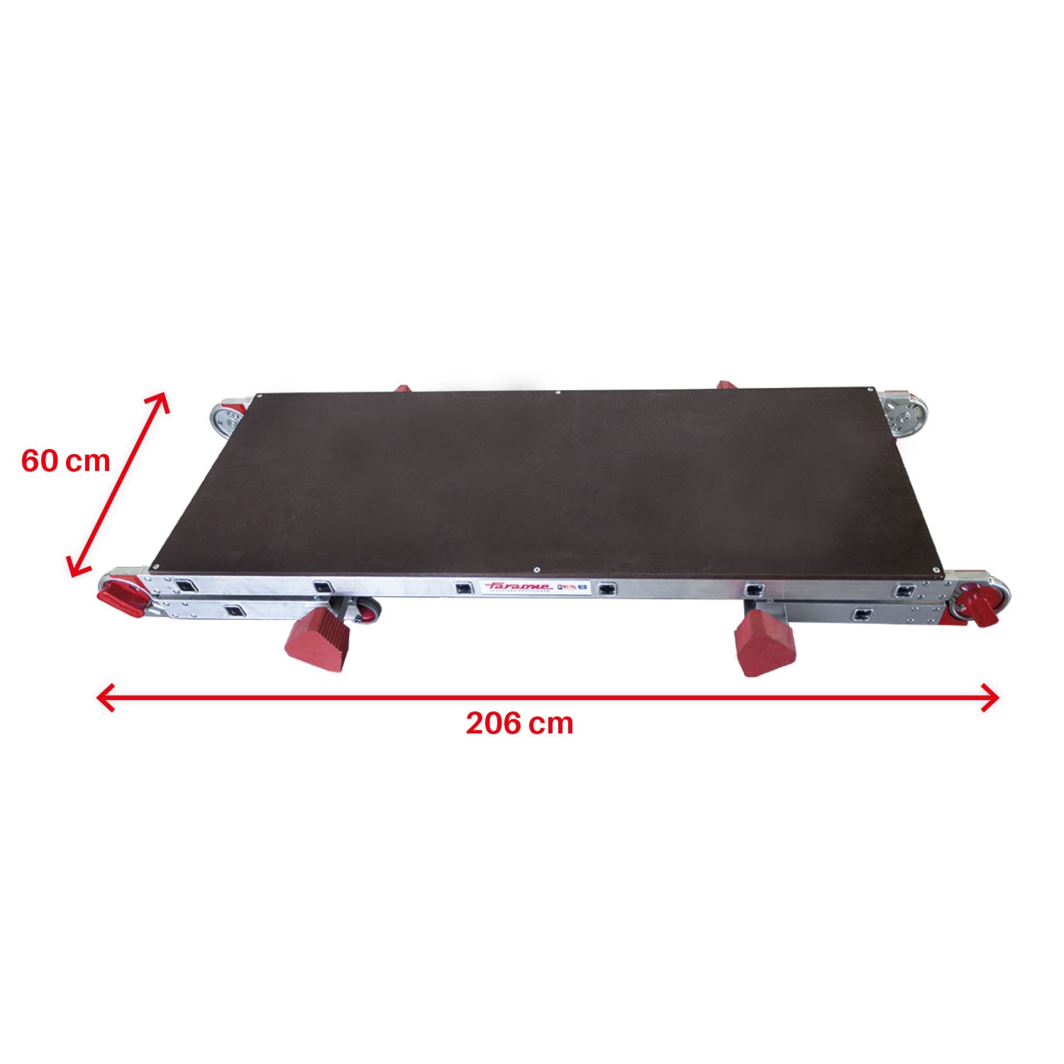 La PLA es una plataforma de trabajo plegable con ruedas y amplio plano de trabajo fabricado con una madera especial resistente al agua. Estructura ligera y robusta fabricada en aluminio con plano de trabajo de 206x60 cm.