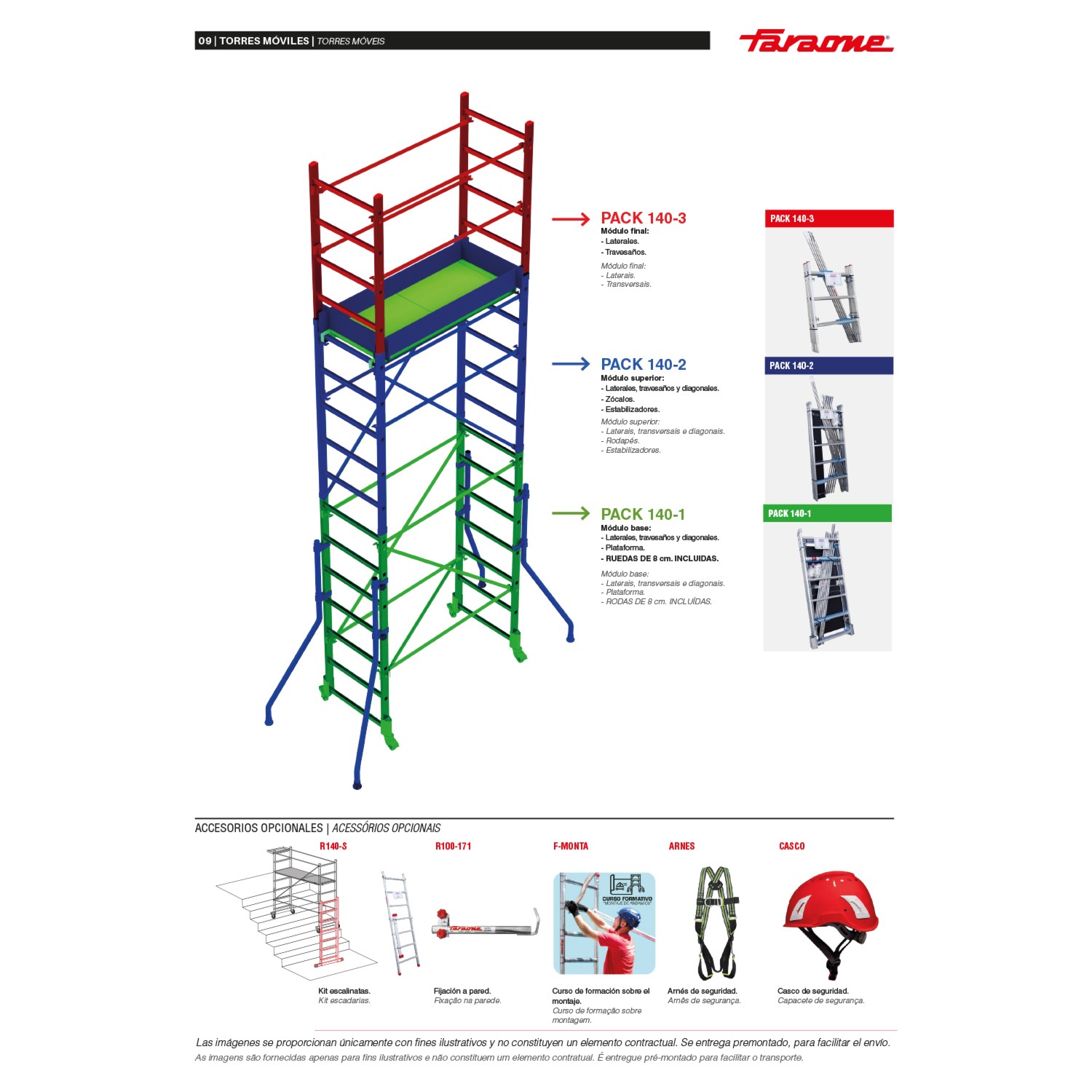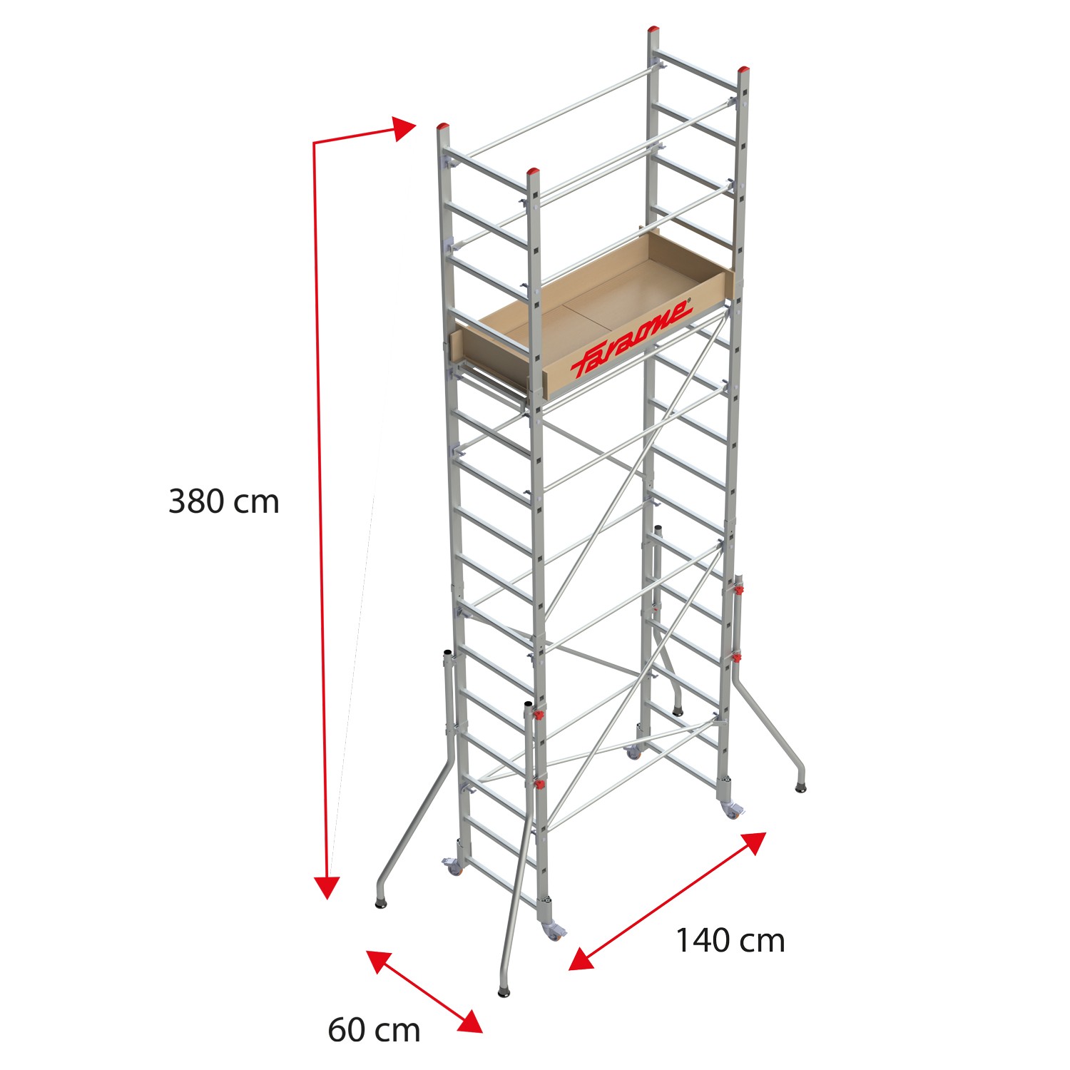 El andamio RAPIDO 140 está fabricado en aluminio, con una plataforma de madera con zócalos de 60x140 cm, ruedas de 8 cm de diámetro y freno a presión y bases estabilizadoras laterales con tapones de alta adherencia.