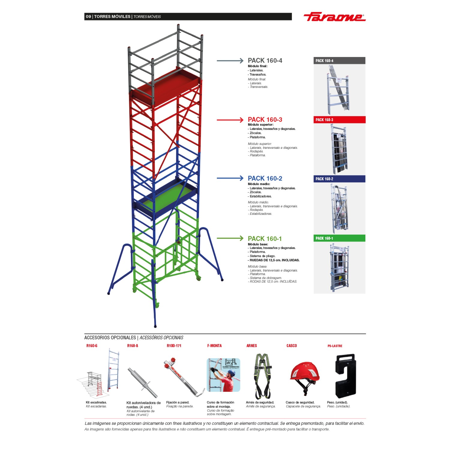 La principal ventaja de este producto es su rápido montaje, ya que dispone de módulos a diferente altura que, combinados, alcanzan la altura de trabajo que se requiera. Dispone de contrapesos de hierro para aumentar la estabilidad de la estructura.