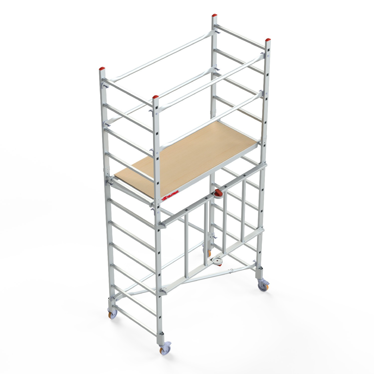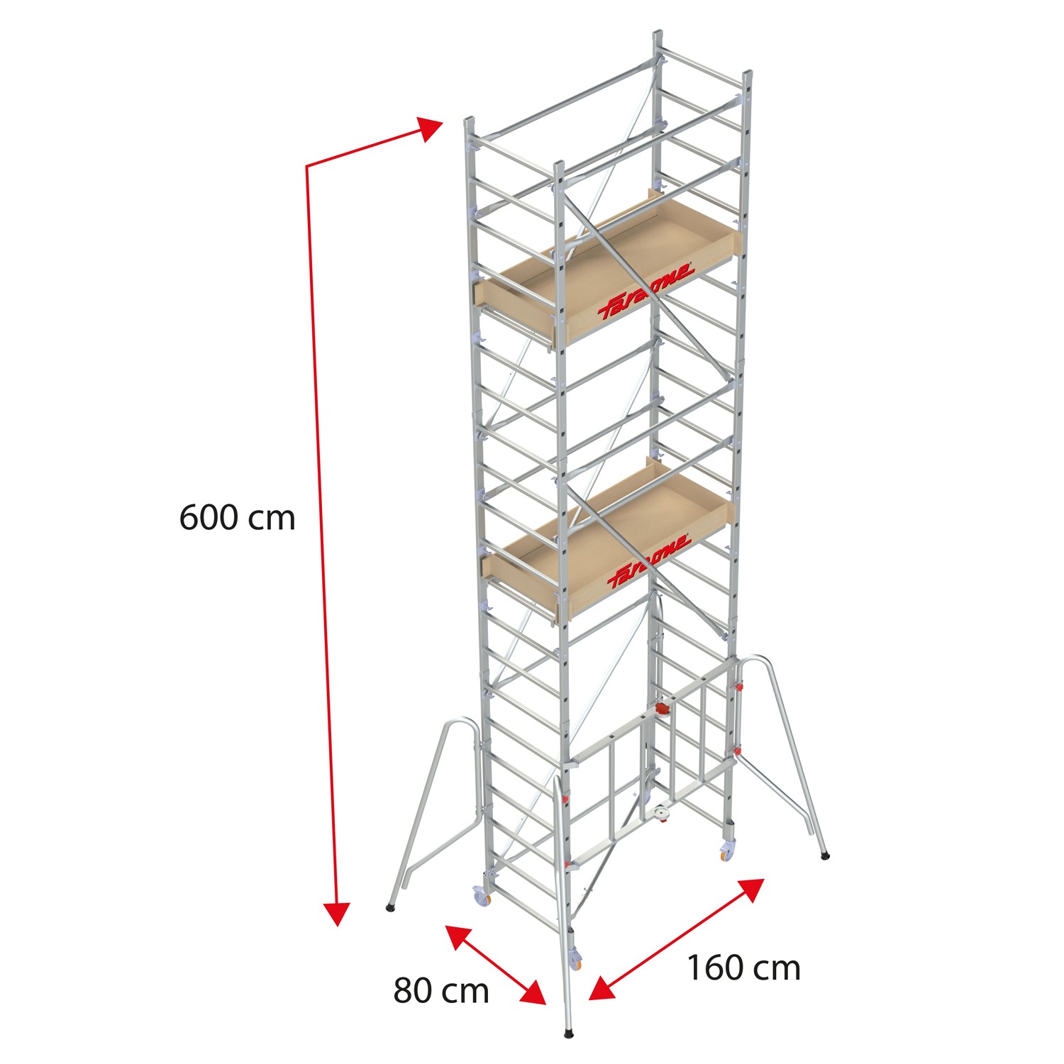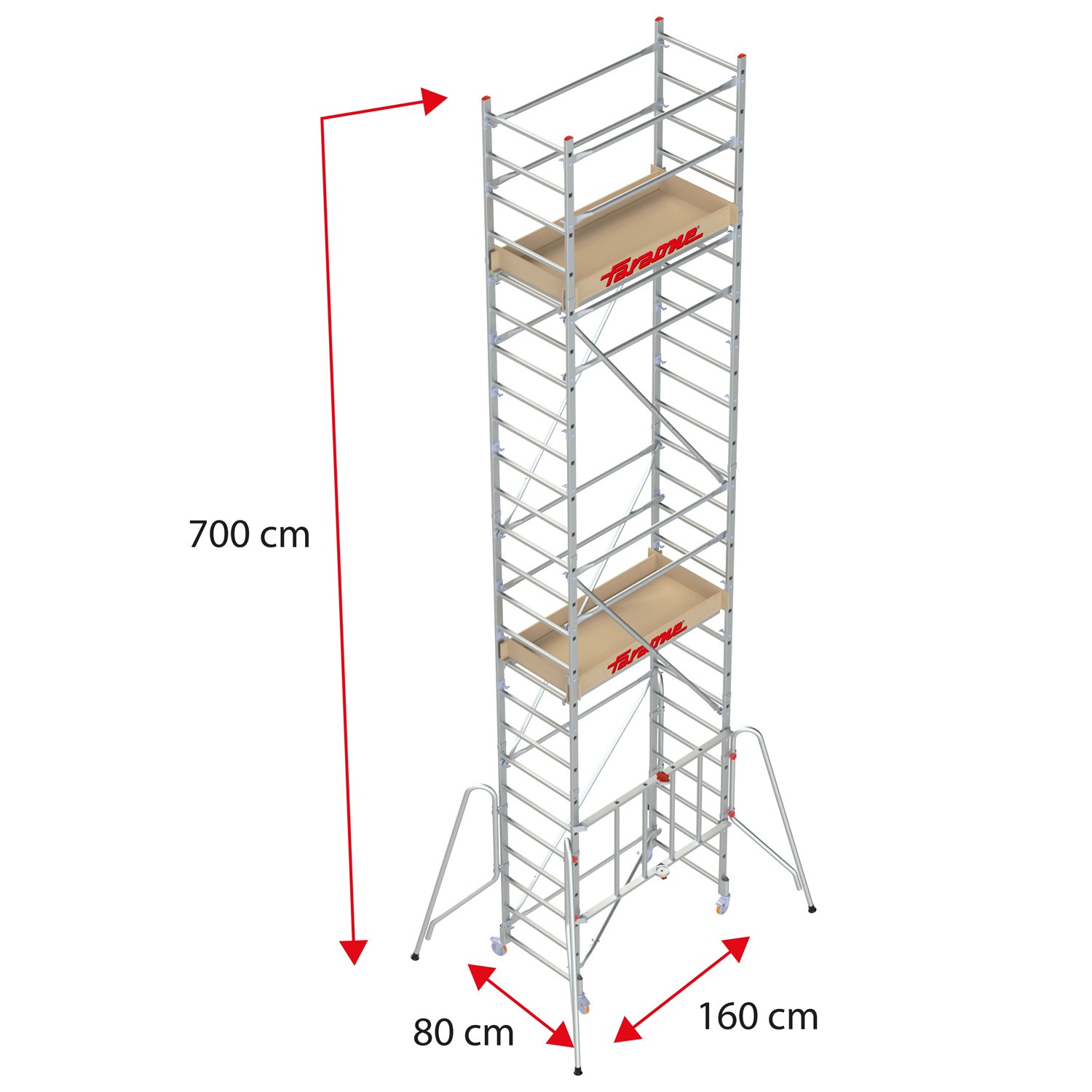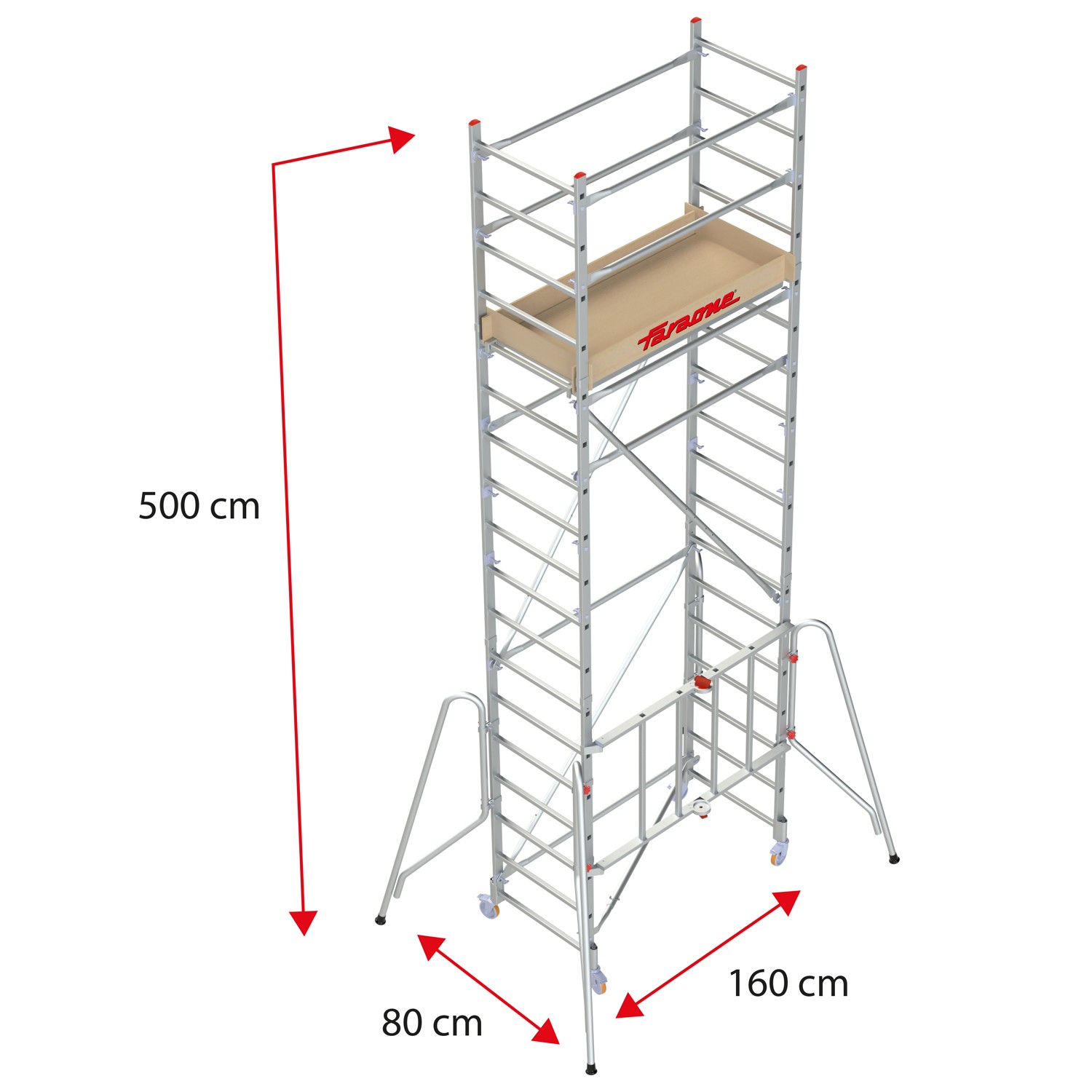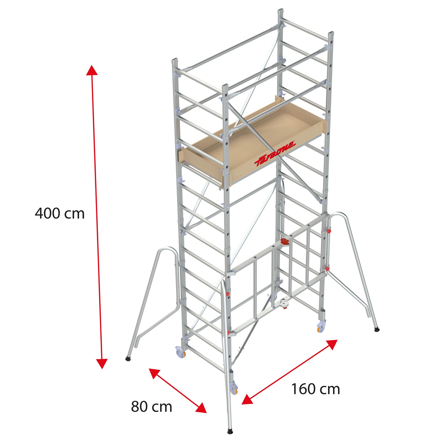 El andamio RAPIDO 160 está fabricado en aluminio, con una plataforma de madera con zócalos de 160x80 cm, ruedas de 12,5 cm de diámetro y freno a presión y bases estabilizadoras laterales con tapones de alta adherencia.