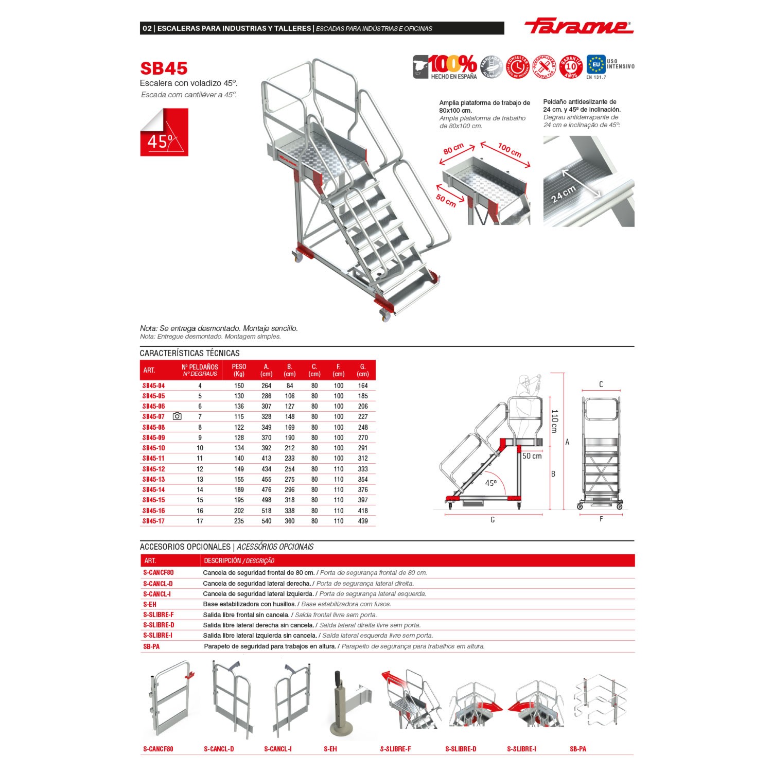 La SB45 es una escalera con vuelo y amplio plano de trabajo antideslizante con acceso mediante una escalera de 45º de inclinación con peldaños antideslizantes de 24 cm de profundidad y pasamanos en ambos lados.