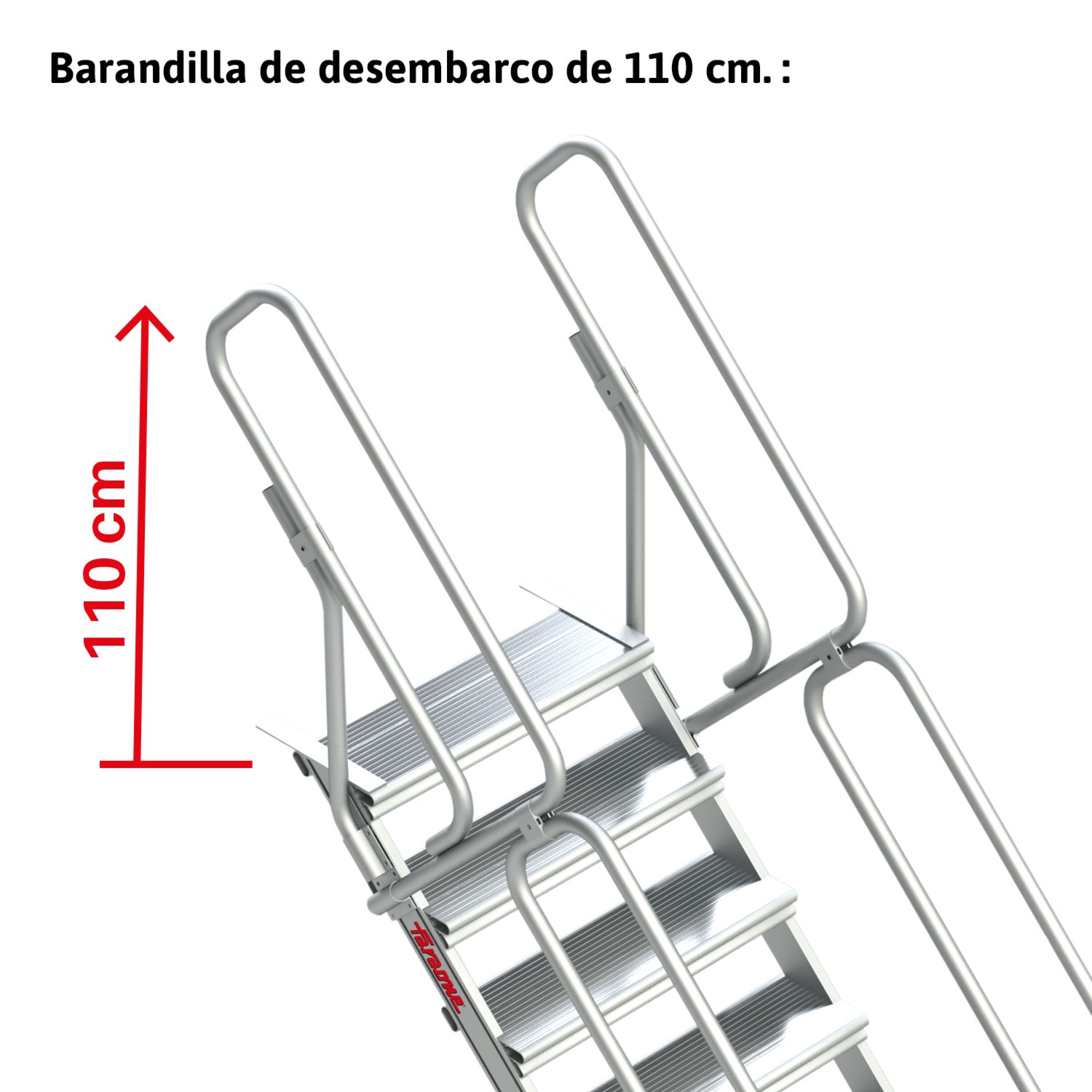 Dispone de barandillas de seguridad lateral y de desembarco, con una altura de 1 metro, diseñadas según normativa.