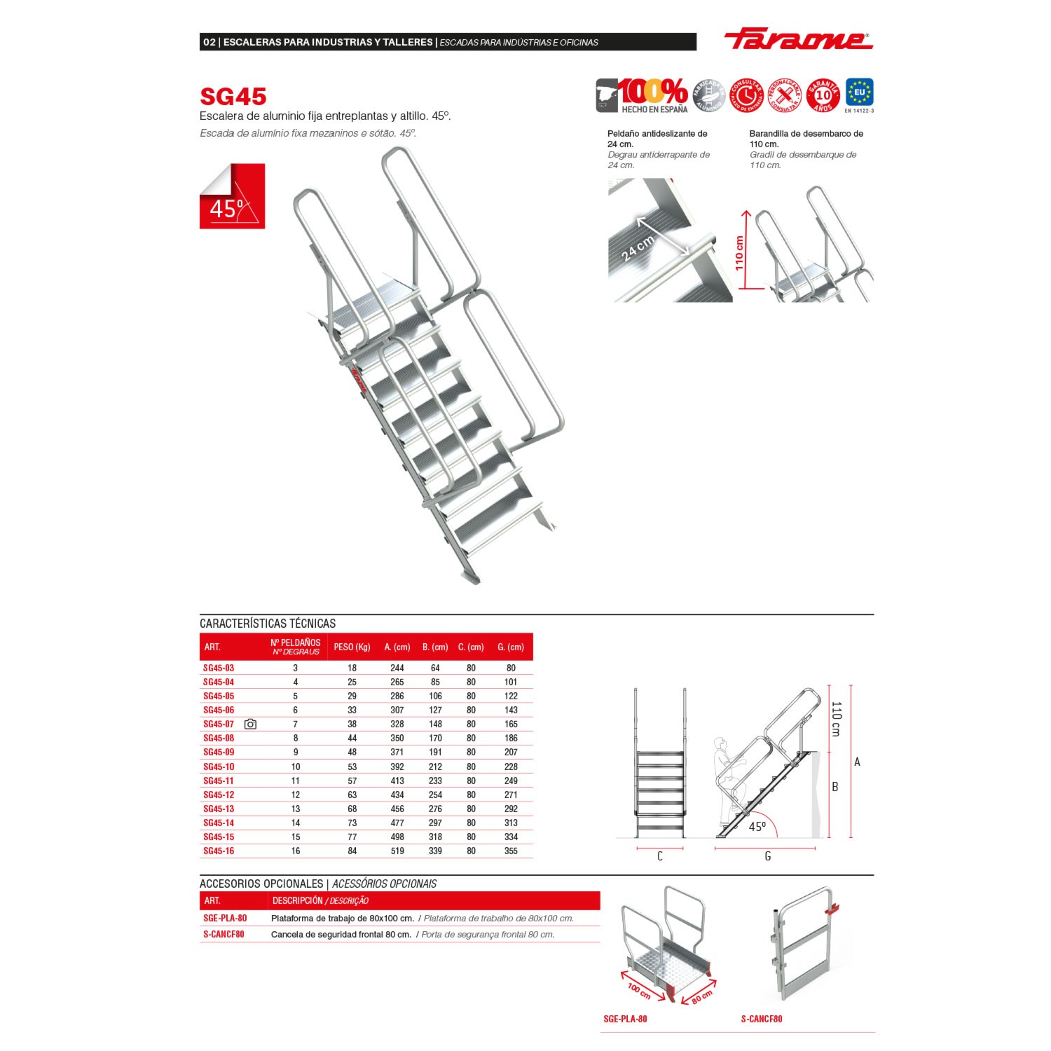 Este producto cumple con la normativa europea EN 14122-3 y se entrega junto con el certificado de conformidad y el manual de instrucciones, la carga máxima que aguanta es de 150 kg.