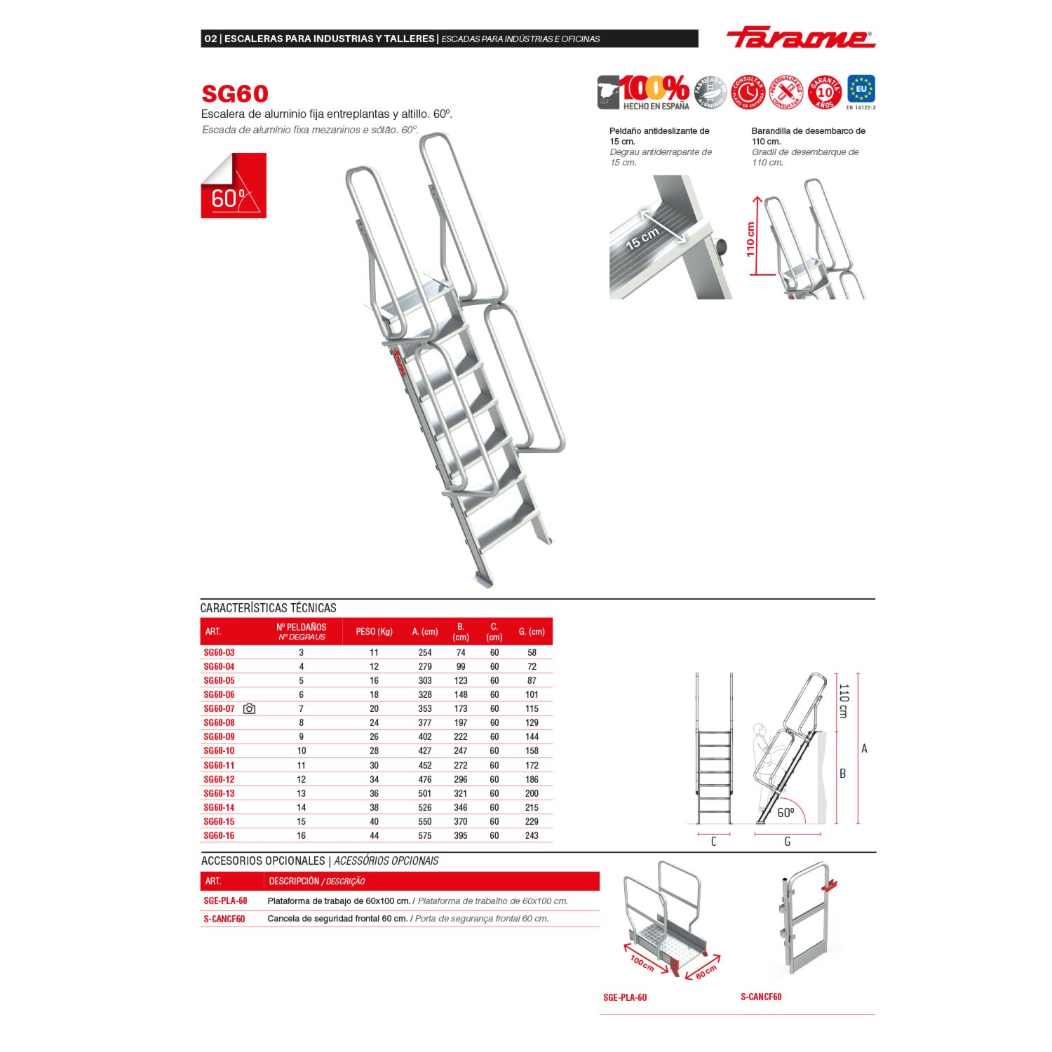 El tramo de ascenso de este producto cumple con la normativa europea EN 14122-3 y se entrega junto con el certificado de conformidad y el manual de instrucciones, la carga máxima que aguanta es de 150 kg.