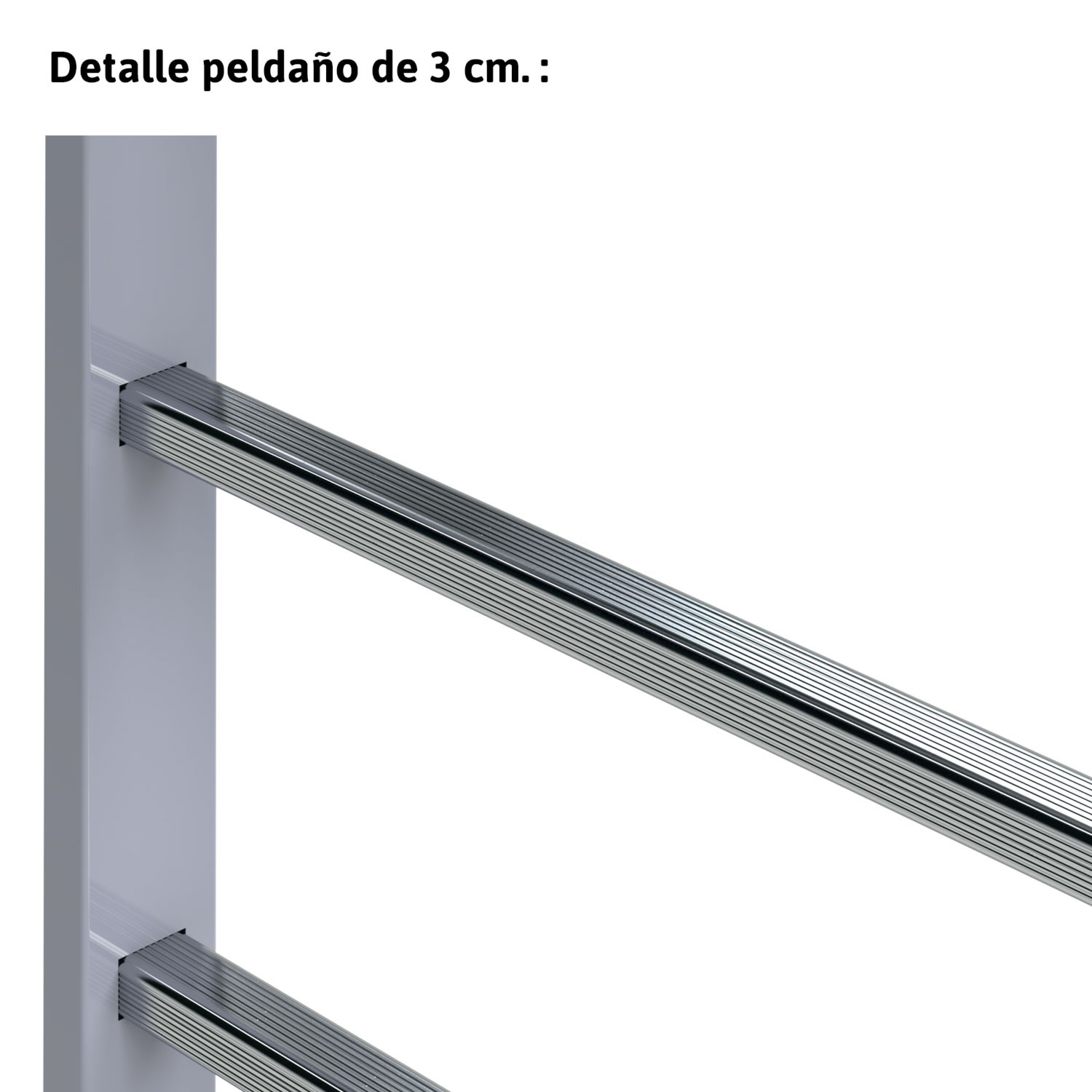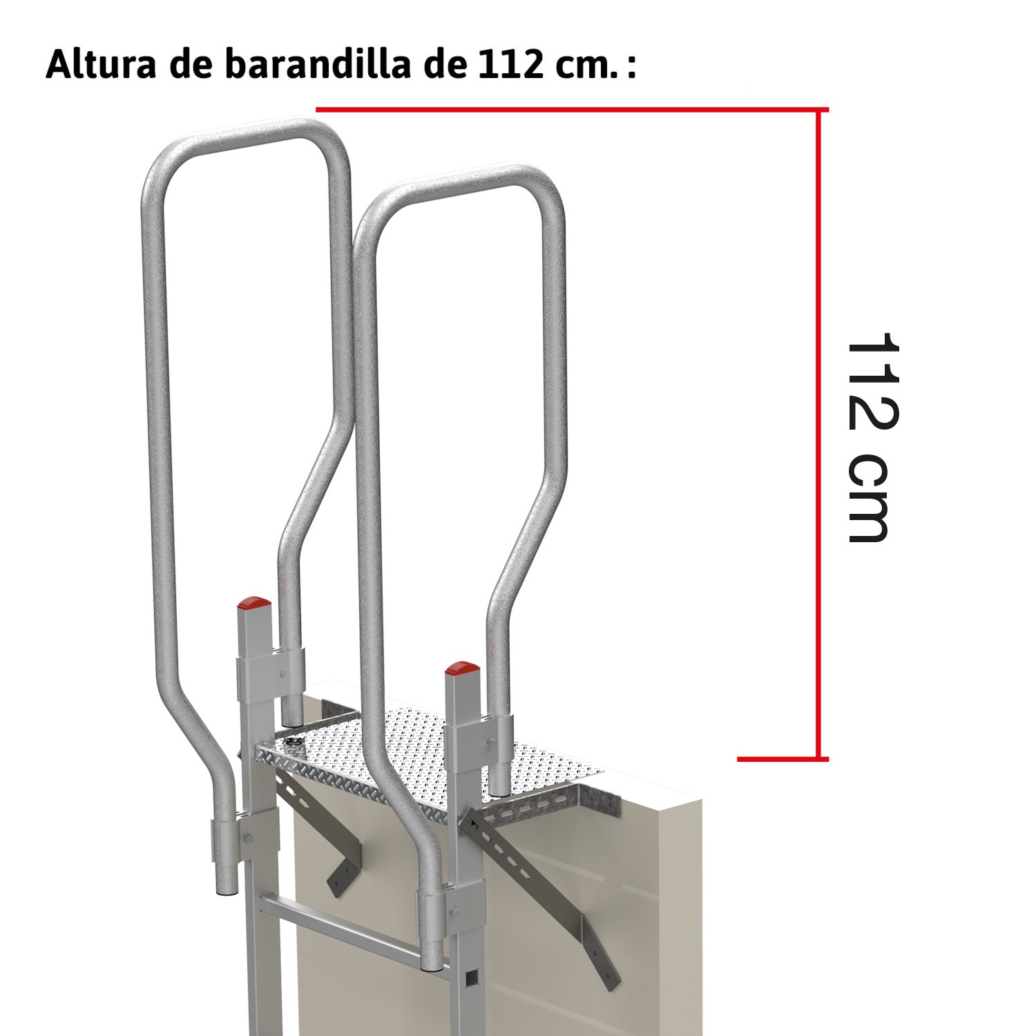 Se suministra con soportes, pletinas para fijar la escalera a la pared y con barandilla de seguridad de 112 cm de altura.
