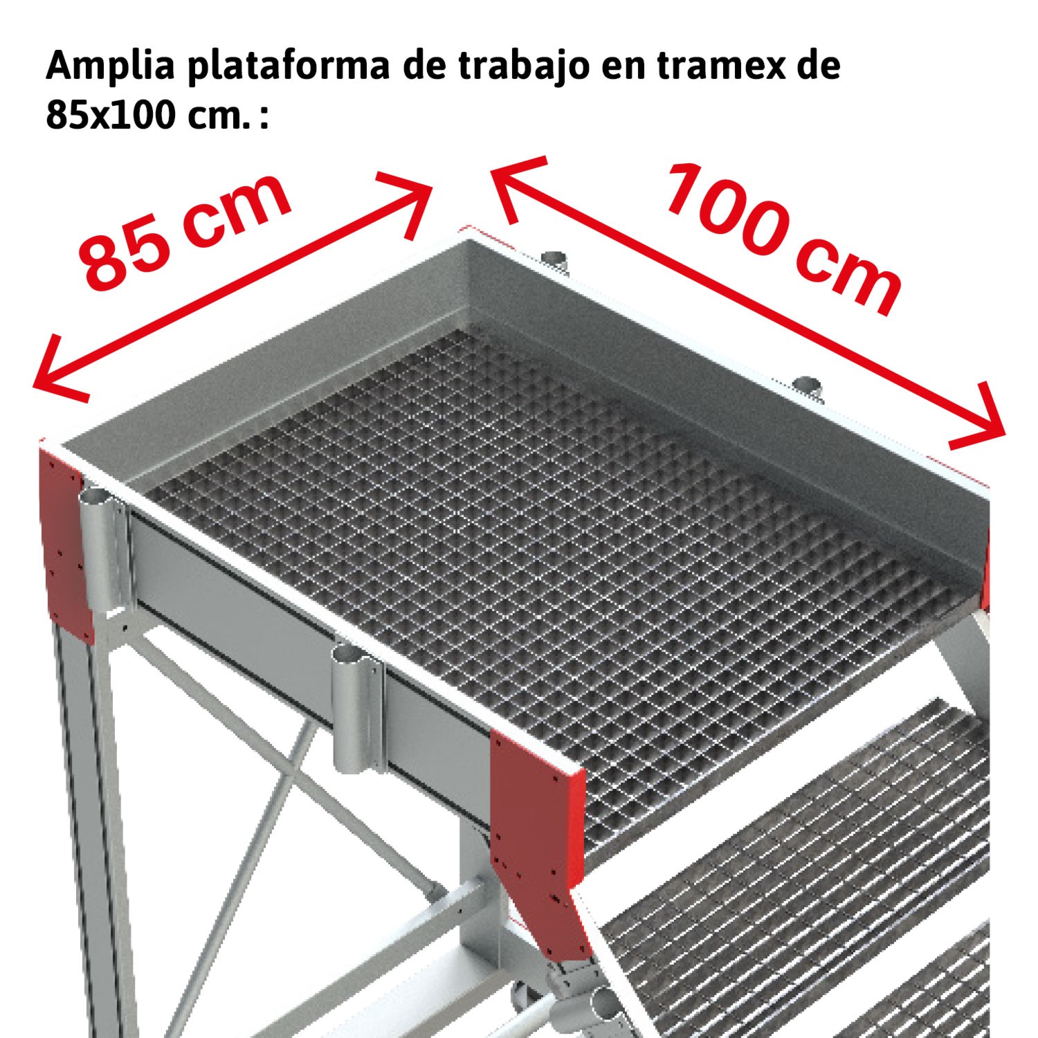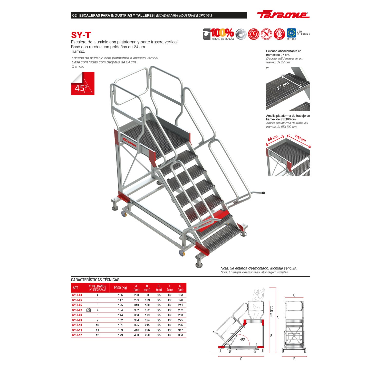 La SY-T es una escalera con ruedas y amplio plano de trabajo antideslizante de 85x100 cm con acceso mediante una escalera de 45º de inclinación con peldaños antideslizantes de 27 cm de profundidad y pasamanos en ambos lados.