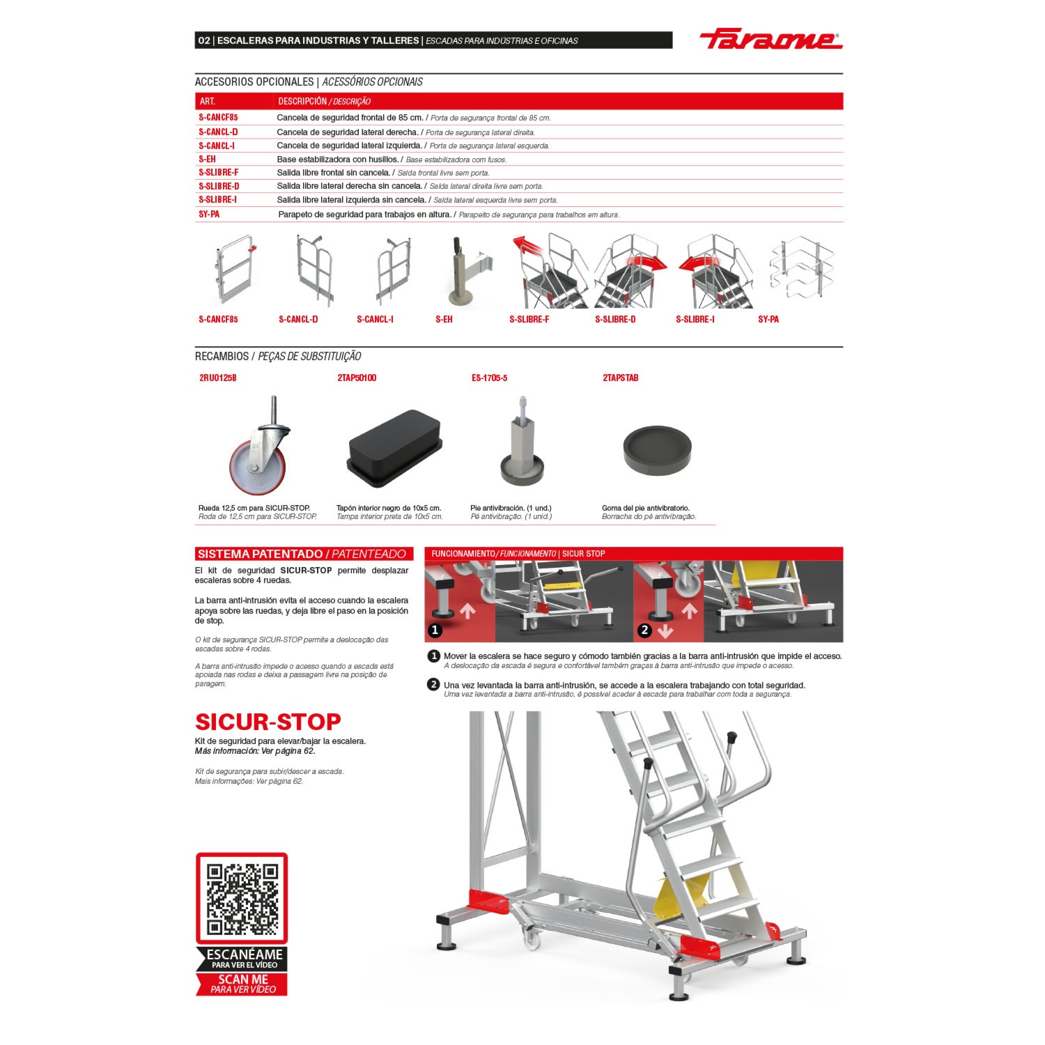 Incluye el sistema patentado SICUR STOP; kit de seguridad que permite desplazar la escalera sobre sus cuatro ruedas. La barra antintrusión evita el acceso cuando la escalera apoya sobre las ruedas y deja libre el paso en la posición de parada “stop”.