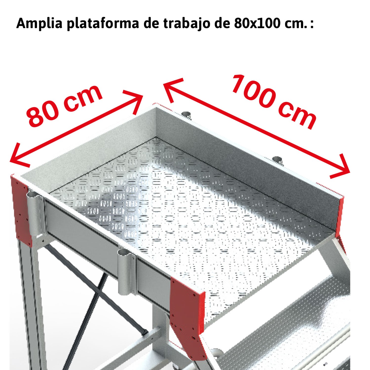 La SY45 es una escalera con ruedas y amplio plano de trabajo antideslizante de 80x100 cm con acceso mediante una escalera de 45º de inclinación con peldaños antideslizantes de 24 cm de profundidad y pasamanos en ambos lados.