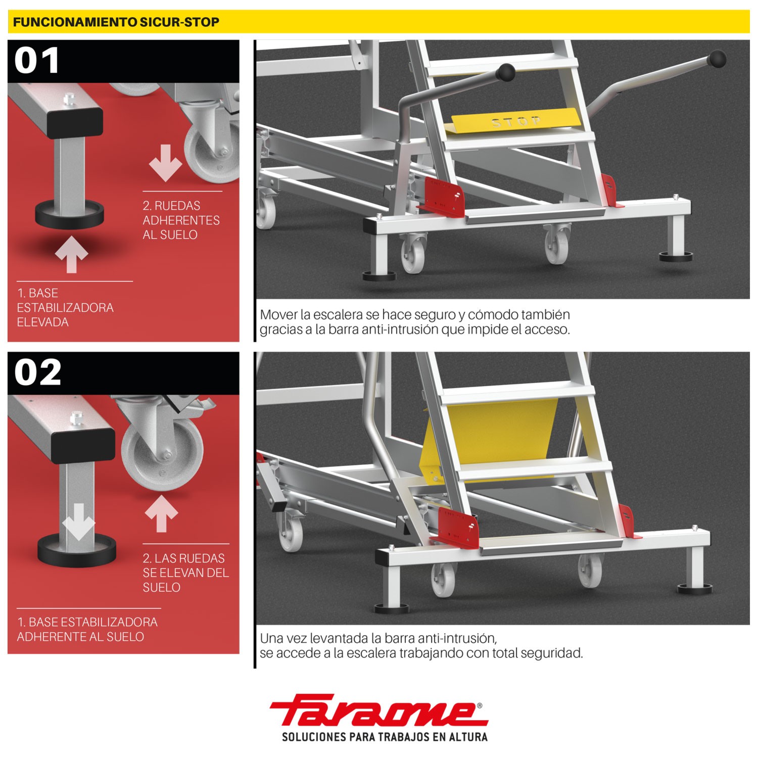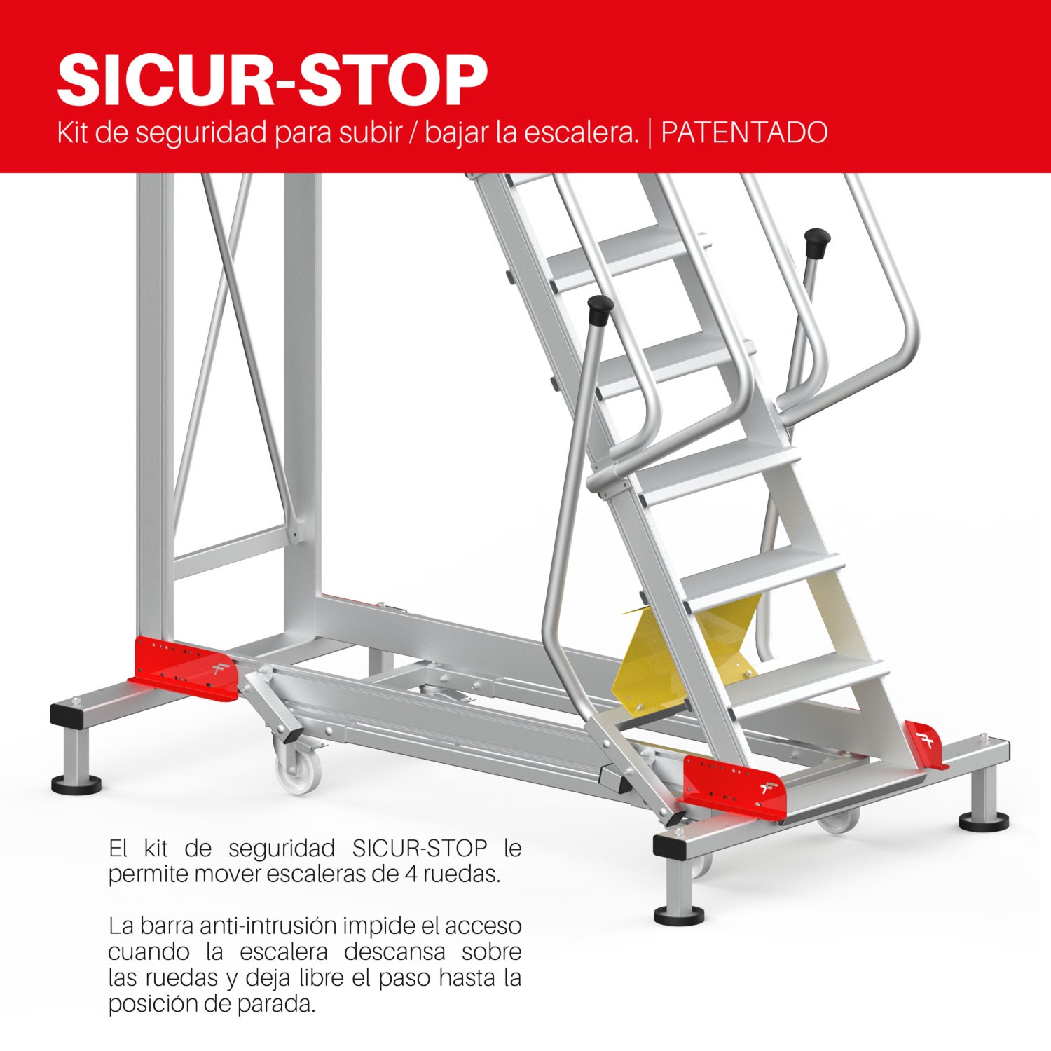 Incluye el sistema patentado SICUR STOP; kit de seguridad que permite desplazar la escalera sobre sus cuatro ruedas. La barra antintrusión evita el acceso cuando la escalera apoya sobre las ruedas y deja libre el paso en la posición de parada “stop”.