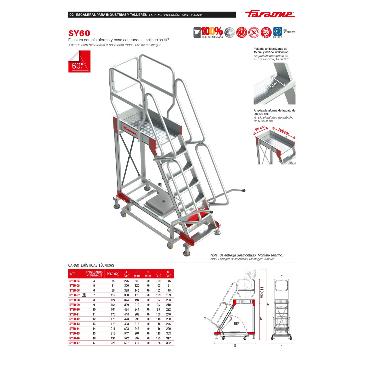 La SY60 es una escalera con ruedas y amplio plano de trabajo antideslizante de 60x100 cm con acceso mediante una escalera de 60º de inclinación con peldaños antideslizantes de 15 cm de profundidad y pasamanos en ambos lados.