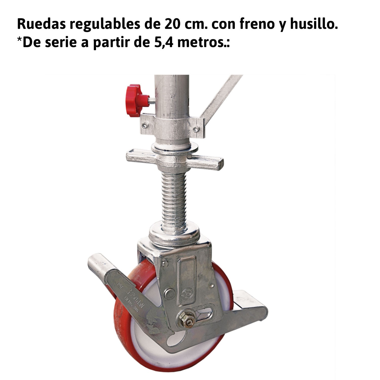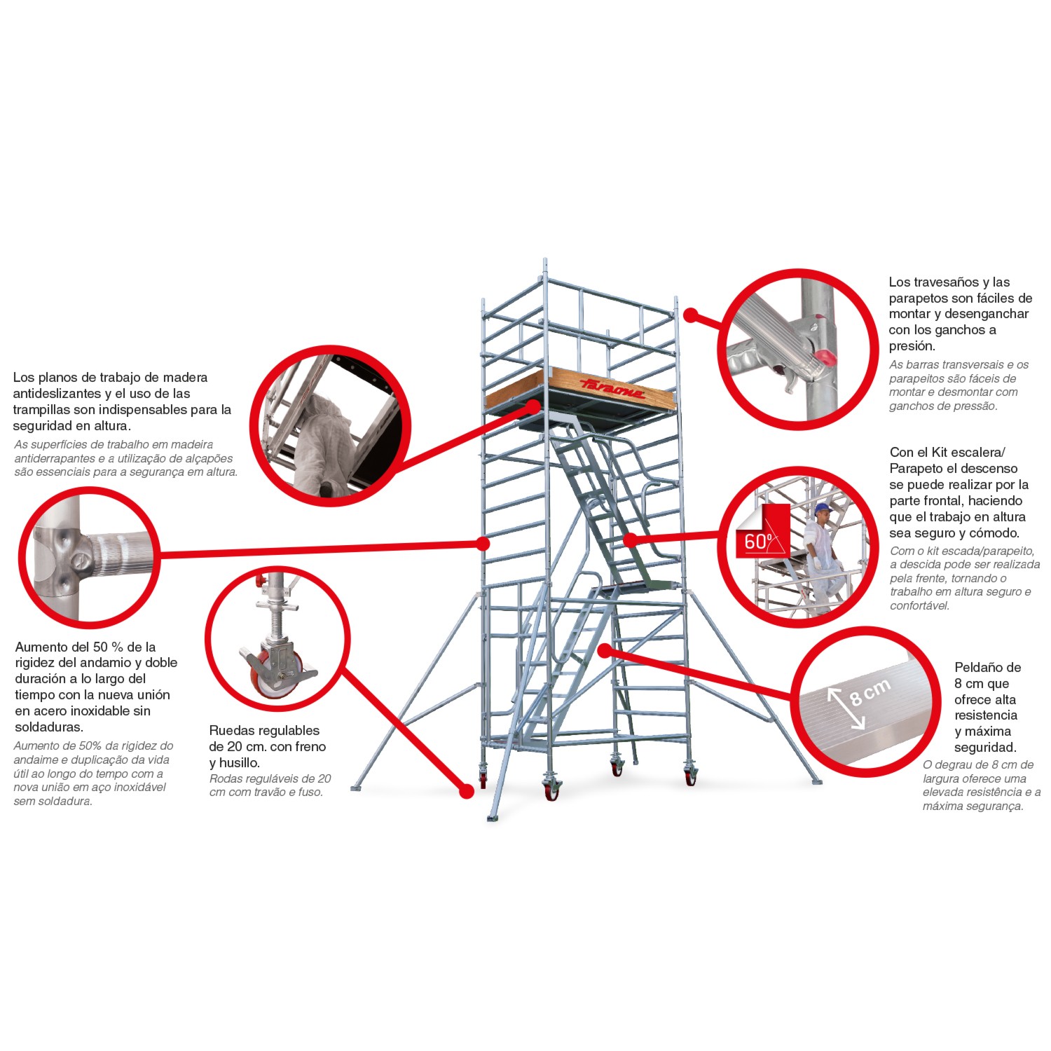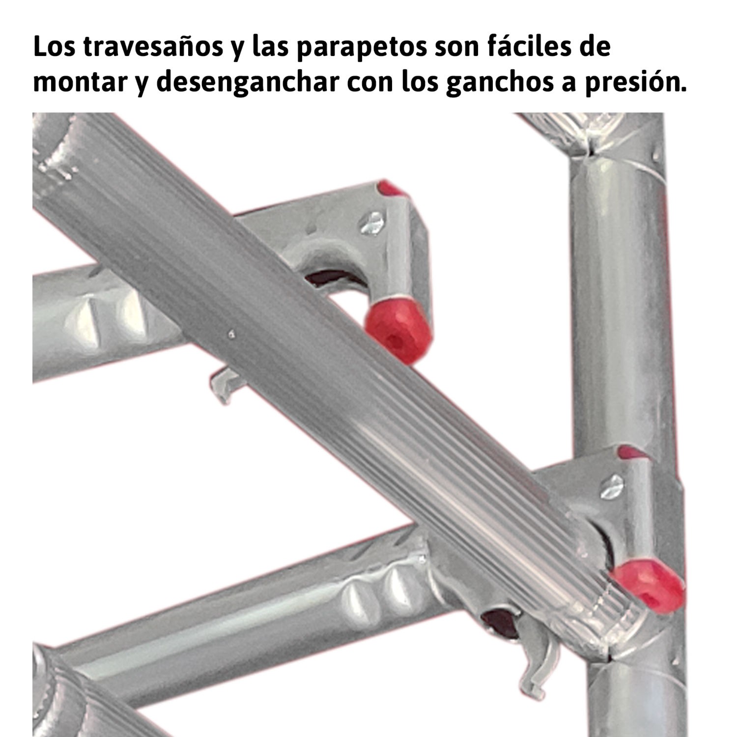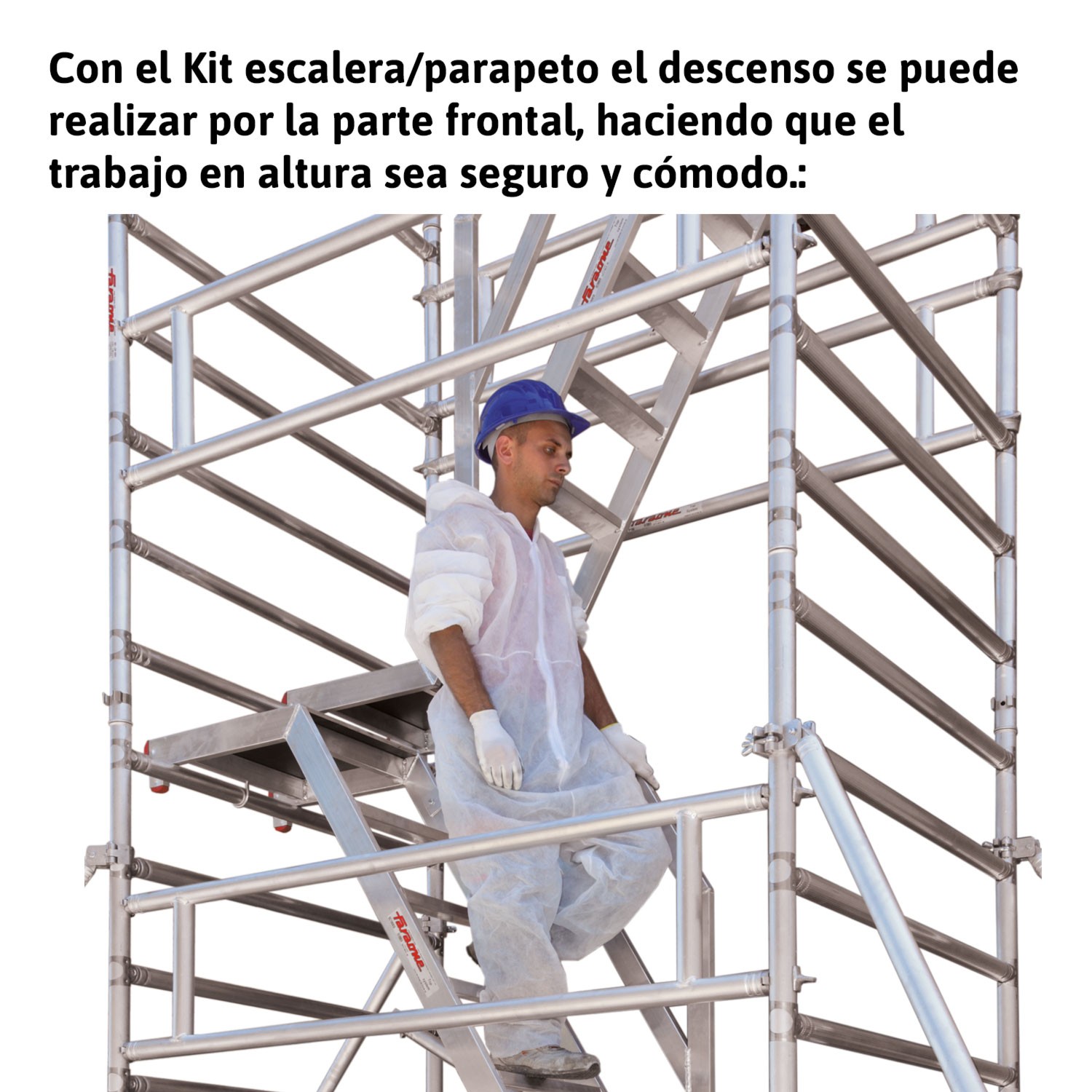 Posee un juego de escaleras con pasamanos que permite bajar al frente, mejorando la seguridad y comodidad de los trabajos en altura.