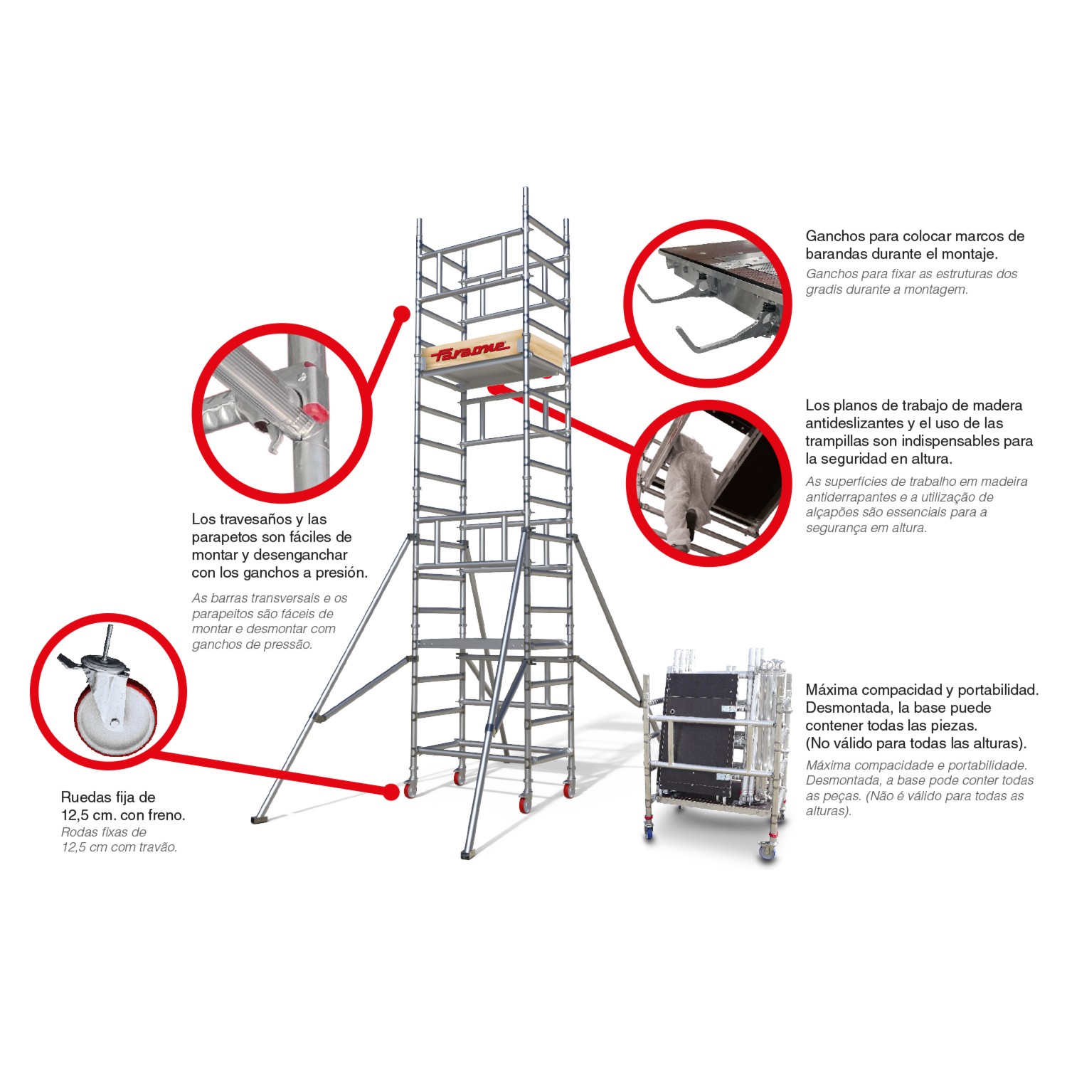 La subida es cómoda gracias a una menor distancia entre peldaños. 7 peldaños por cada lateral en lugar de los 6 que se suelen poner en los laterales de los andamios disponibles en el mercado.