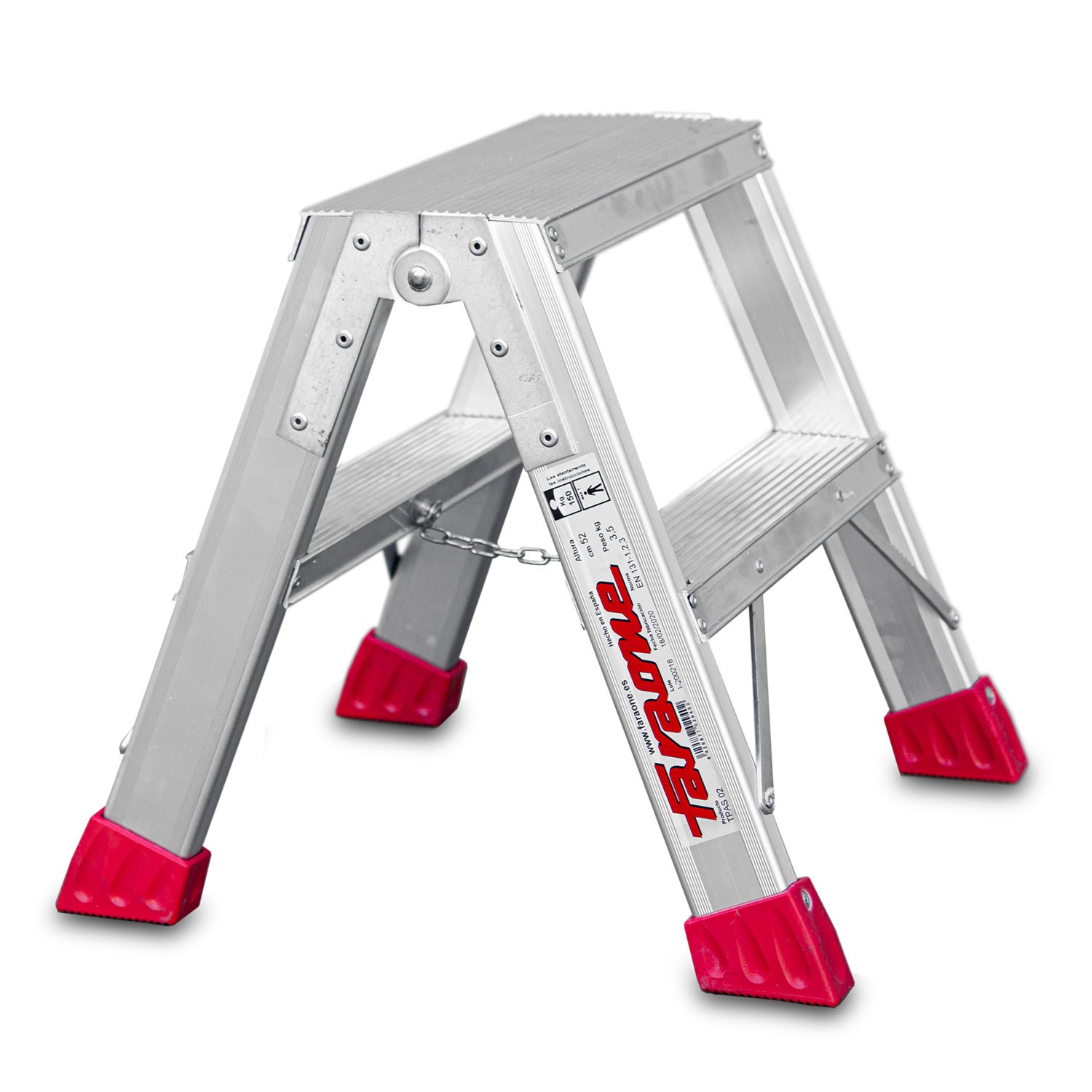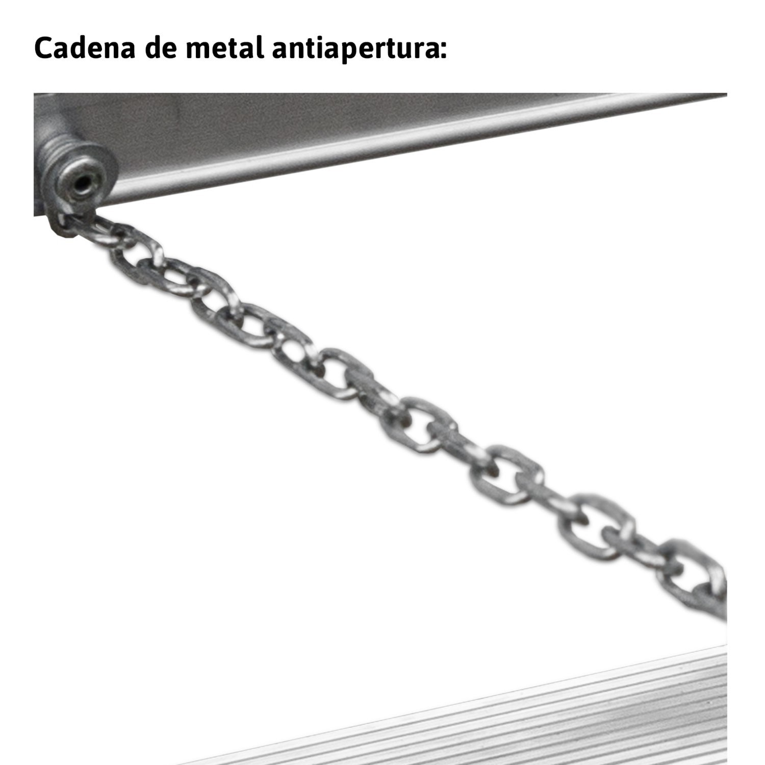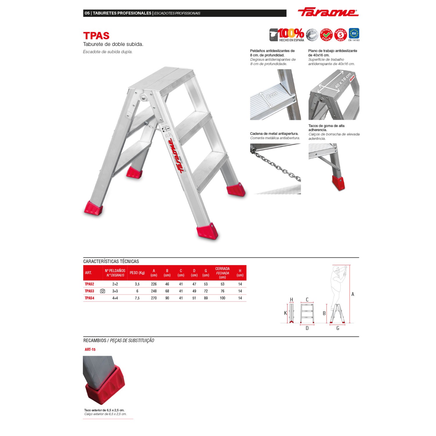 El modelo TPAS está fabricado en aluminio, posee un sistema de bisagras rígido y resistente entre los dos tramos de subida, un sistema anti cierre seguro, peldaños de 8 cm y amplios tacos de goma con gran agarre a la superficie.